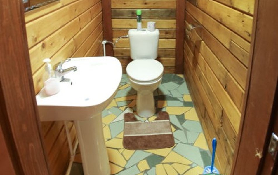Санузел: душ, раковина, унитаз, тапочки, туалетные принадлежности
